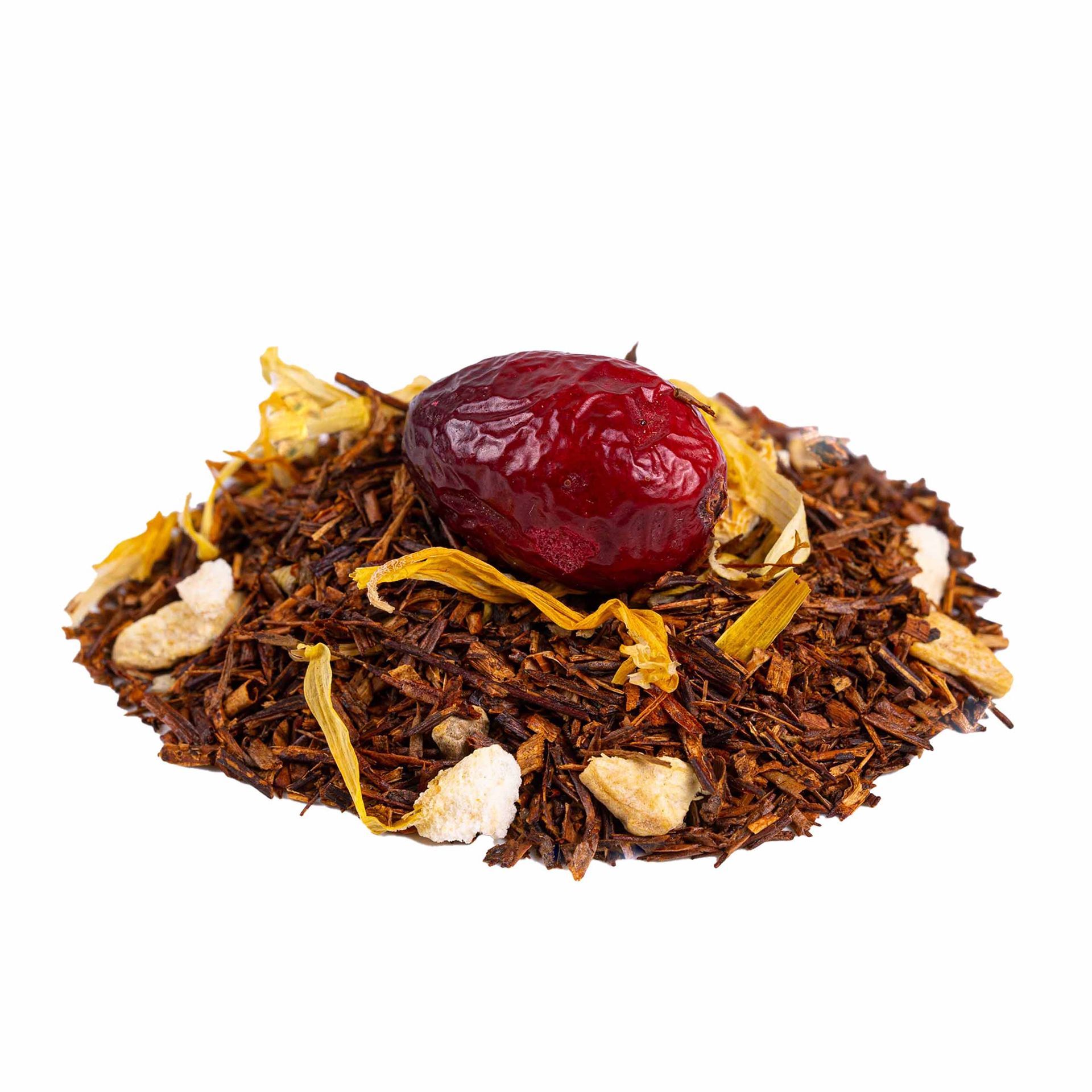 Laat je kracht en energie voelen met deze verwarmende rooibosmelange. Lions Head combineert de fruitige frisheid van cranberry met de sprankelende tonen van sinaasappel en de pittige warmte van gember. De natuurlijke rooibosbasis geeft een zachte, ronde body waarin de smaken perfect in balans samenkomen.